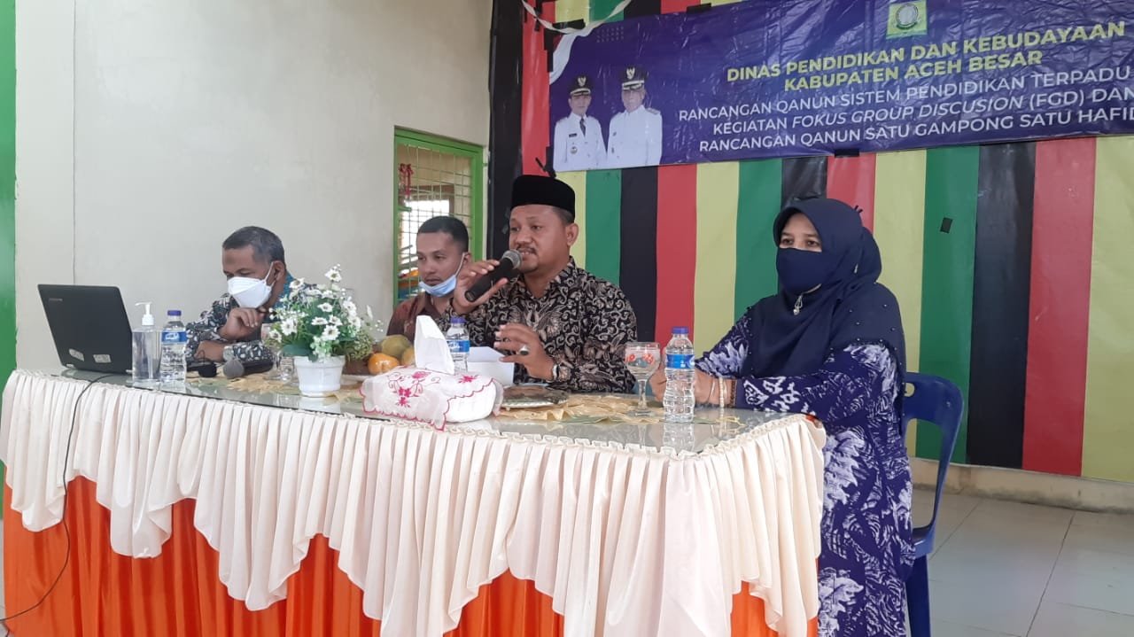 Aceh Besar – Pemerintah Aceh Besar melalui Dinas Pendidikan dan Kebudayaan (Disdikbud ) kembali melakukan Fokus Group Diskusi (FGD) Rancangan Qanun (Raqan) Sistem Pendidikan Terpadu (SPT) dan Satu Gampong Satu Hafidz, Kamis (15/7/202) di Aula SMPN 3 Ingin Jaya, Aceh Besar.