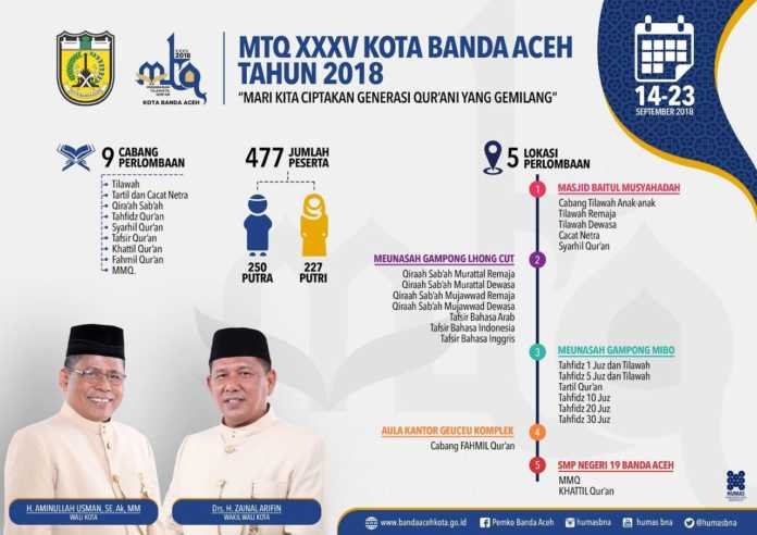 “Iya, MTQ ke-35 tingkat Kota Banda Aceh tahun 2018 akan dimulai besok malam dan dijadwalkan akan dibuka langsung oleh Pak Wali,” ujar Kabag Humas Setdako Banda Aceh Taufiq Alamsyah, Kamis (13/9/2018) di balai kota.
