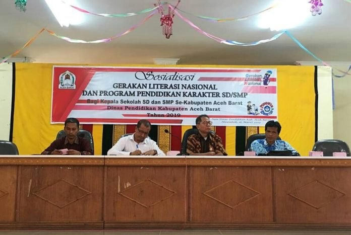 SANTERDAILY.COM | ACEH BARAT–-Dinas Pendidikan Kabupaten Aceh Barat mencanangkan Gerakan Literasi melalui pelaksanaan Sosialisasi Gerakan Literasi Nasional dan Program Pendidikan Karakter bagi Kepala SD/SMP Se-Kabupaten Aceh Barat di Aula Dinas Pendidikan Kabupaten Aceh Barat pada Sabtu (16/3/2019).