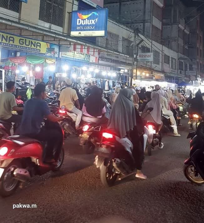 Warga tampak memadati pertokoan untuk membeli pakaian baru, kue lebaran, hingga kebutuhan rumah tangga lainnya. Suasana belanja semakin meningkat seiring semakin dekatnya hari raya, yang juga berdampak pada kepadatan arus lalu lintas di titik-titik pusat pertokoan.