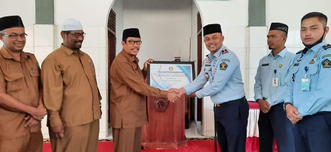 ACEH BESAR–Kantor Kementerian Agama Kabupaten Aceh Besar selasa (14/7) menerima penghargaan dari kepala rumah tahanan negara kelas II B Banda Aceh, Irhamuddin SH MH di Masjid At Tawabin komplek Rutan Kajhu Kecamatan Baitussalam Aceh Besar.
