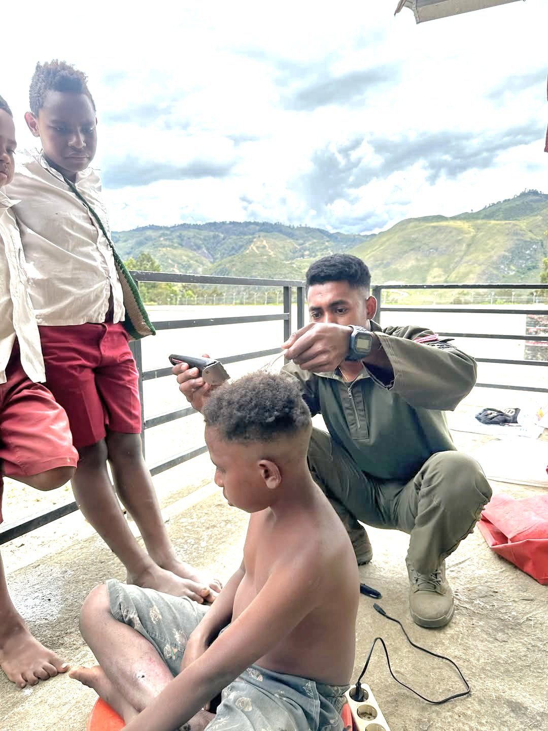 Kegiatan yang bertajuk Pangkas Rambut Anak-anak Papua ini berlangsung di Pos Blukar 6.7, Tiom, pada Jumat, 14 Maret 2025.