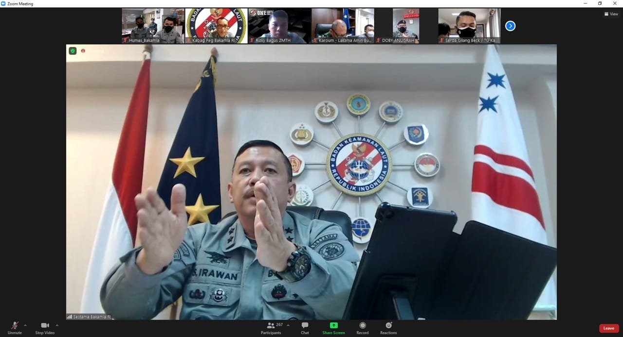 Kepada media ini Kepala Badan Keamanan Laut (Bakamla) RI Laksdya TNI Aan Kurnia, S. Sos., M. M., yang diwakilkan Sekretaris Utama (Sestama) Bakamla RI Laksda TNI S. Irawan, M.M. memberikan pengarahan kepada ratusan personel Bakamla RI yang berdinas di Mabes Bakamla RI, Kantor Zona, SPKKL, Stasiun Bumi dan Kapal Negara (KN) secara daring dari Ruang Kerja Sestama Bakamla RI, Jl. Proklmasi No. 56, Menteng, Jakarta Pusat, Selasa (31/8/2021).