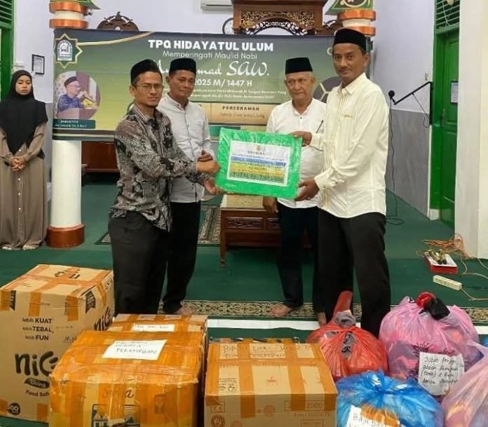 KABARDAILY.COM,Banda Aceh-Direktur Taman Pendidikan Al-Qur`an Hidayatul Ulum (TPQ HU) Ustad Edy Iswandy, S.Sos menyerahkan donasi berupa uang sebesar Rp 7.933.000 dan beberapa karung baju layak pakai kepada Pj Keuchik Lambaro Skep Zam Zami yang didampingi Ketua Tuha Peut Gampong drh Firdaus Haiyar, Ketua Pembina Orang Tua Asuh Ir H. Mukhlis Ja’far, MM dan juga Keuchik terpilih periode 2026 – 2032 pada moment Maulid, Tasyakur, sekaligus Bagi Raport Santri. (Minggu, 21 Desember 2025)