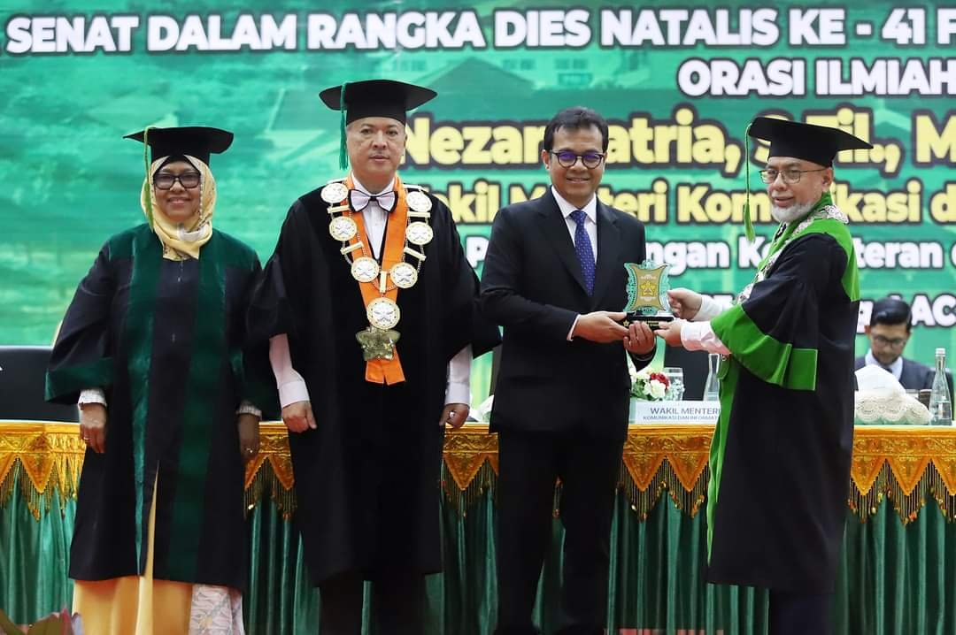 KABARDAILY.COM | Fakultas Kedokteran Universitas Syiah Kuala (FK USK) memperingati dies natalis ke-41. Ada sejumlah kegiatan yang mengisi perayaan ini, salah satu yang paling penting adalah orasi ilmiah. Wakil Menteri Komunikasi dan Informasi (Wamenkominfo) RI, Nezar Patria, S.Fil, M.Sc, M.BA dipercayakan mengisi orasi ilmiah dalam sidang terbuka dies natalis ini, yang berlangsung di Gedung AAC Dayan Dawood, Kamis, 26 Oktober 2023.
